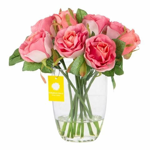 - Features faux roses inside the vase.